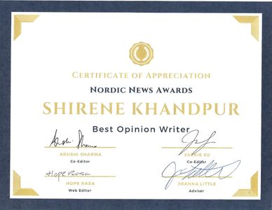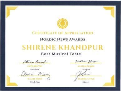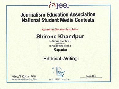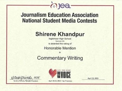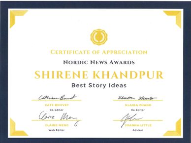 Nordic News is a nationally award-winning student publication reporting on Inglemoor High School in Kenmore, Washington for over 50 years. Shirene Khandpur is the Editor of her school newspaper and has won several awards and accolades at journalism events locally, nationally, and internationally. Under her Mentor & Advisor Ms. Joanna Little, Shirene is dedicated to improving her craft, promoting journalistic values and exploring change through her online and print publication. The newspaper's print version is published several times per year, and the website features exclusive written and multimedia content.